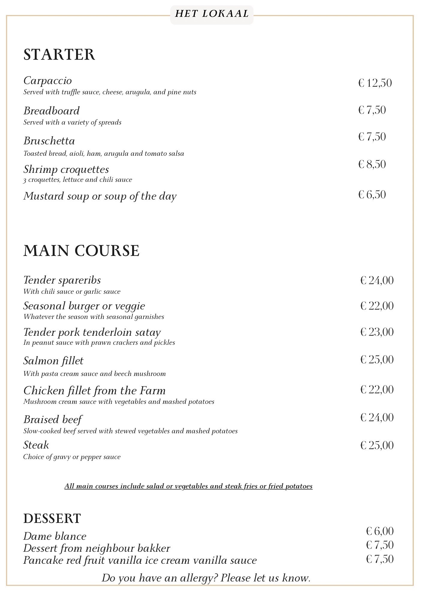 The famous Sate and Spareribs, top dishes at Het Lokaal, are accompanied by variants of Beef Tenderloin and Pokebowl, among others.
