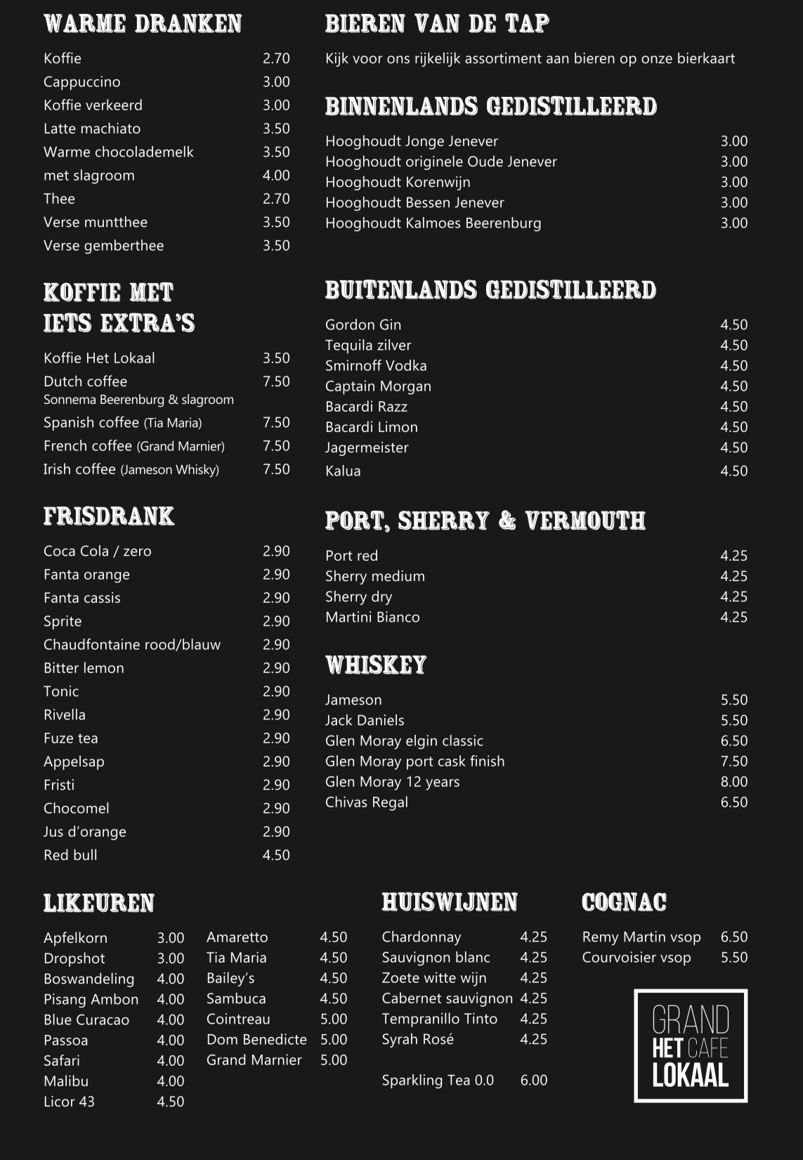 Naast de verschillende dranken bieden wij bij Grand Café Het Lokaal een menukaart met voor ieder wat wils.